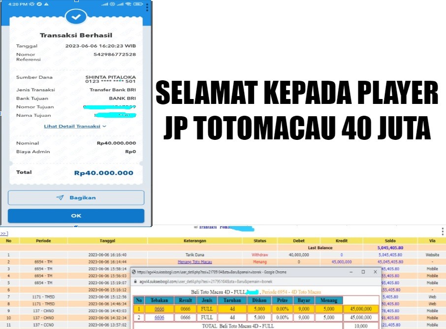 Selamat kepada User id : Juk** Telah berhasil mendapatkan kemenangan besar pada permainan TOGEL TOTOMACAU Dengan kemenangan Sebesar Rp.40.000.000,- Setelah mengisi formulir withdraw dengan kurung waktu hanya 5 – 10 menit pihak NICETOGEL sudah melakukan transfer kepada pemilik Userid dan dana sudah dapat di cairkan oleh pemenang. Bukti pembayaran yang kami berikan merupakan bukti pembayaran yang SAH / VALID yang langung di dapatkan melaui tanda transfer transaksi dari Bank yang di tuju.