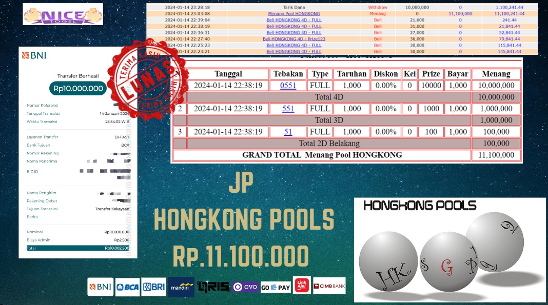 Selamat kepada User id : as***** Telah berhasil mendapatkan kemenangan besar pada permainan HONGKONG POOLS Dengan kemenangan Sebesar Rp.11.100.000,- Setelah mengisi formulir withdraw dengan kurung waktu hanya 5 – 10 menit pihak NICETOGEL sudah melakukan transfer kepada pemilik Userid dan dana sudah dapat di cairkan oleh pemenang. Bukti pembayaran yang kami berikan merupakan bukti pembayaran yang SAH / VALID yang langung di dapatkan melaui tanda transfer transaksi dari Bank yang di tuju.