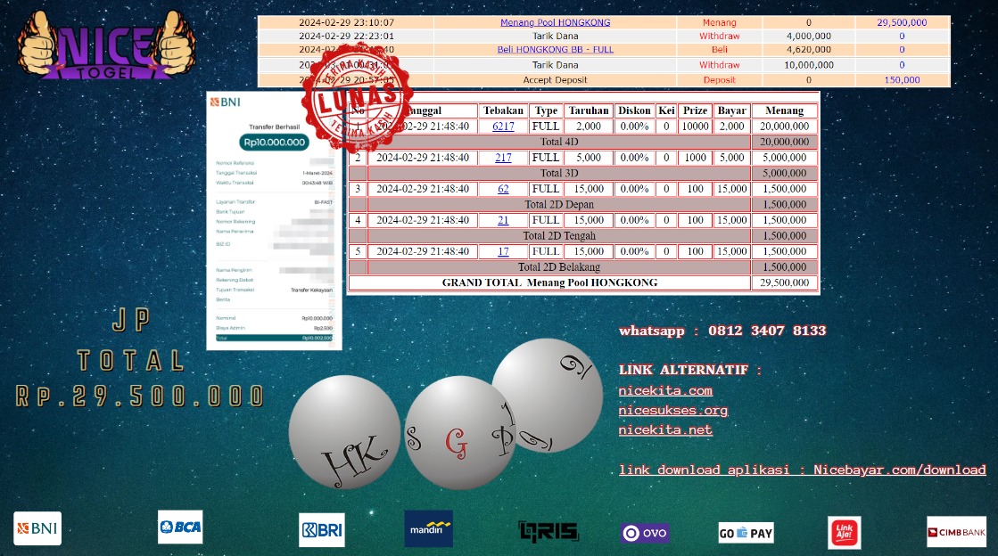 Selamat kepada User id : ba***** Telah berhasil mendapatkan kemenangan besar pada permainan HONGKONG POOLS Dengan kemenangan Sebesar Rp.29.500.000,- Setelah mengisi formulir withdraw dengan kurung waktu hanya 5 – 10 menit pihak NICETOGEL sudah melakukan transfer kepada pemilik Userid dan dana sudah dapat di cairkan oleh pemenang. Bukti pembayaran yang kami berikan merupakan bukti pembayaran yang SAH / VALID yang langung di dapatkan melaui tanda transfer transaksi dari Bank yang di tuju.