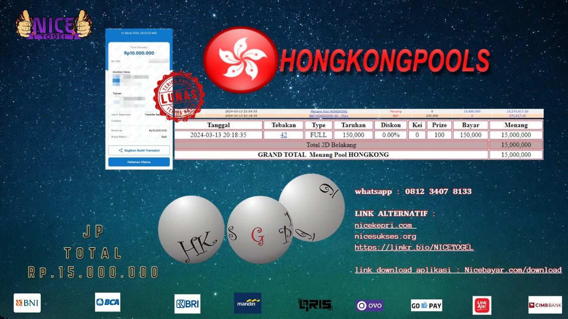 Selamat kepada User id : Oil** Telah berhasil mendapatkan kemenangan besar pada permainan TOGEL HONGKONG Dengan kemenangan Sebesar Rp.15.000.000,- Setelah mengisi formulir withdraw dengan kurung waktu hanya 5 – 10 menit pihak NICETOGEL sudah melakukan transfer kepada pemilik Userid dan dana sudah dapat di cairkan oleh pemenang. Bukti pembayaran yang kami berikan merupakan bukti pembayaran yang SAH / VALID yang langung di dapatkan melaui tanda transfer transaksi dari Bank yang di tuju.