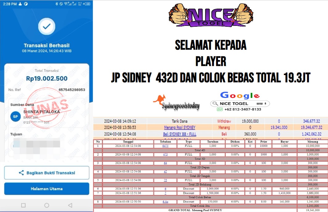 Selamat kepada User id : a*** Telah berhasil mendapatkan kemenangan besar pada permainan TOGEL SYDNEY Dengan kemenangan Sebesar Rp.19.341.000,- Setelah mengisi formulir withdraw dengan kurung waktu hanya 5 – 10 menit pihak NICETOGEL sudah melakukan transfer kepada pemilik Userid dan dana sudah dapat di cairkan oleh pemenang. Bukti pembayaran yang kami berikan merupakan bukti pembayaran yang SAH / VALID yang langung di dapatkan melaui tanda transfer transaksi dari Bank yang di tuju.
