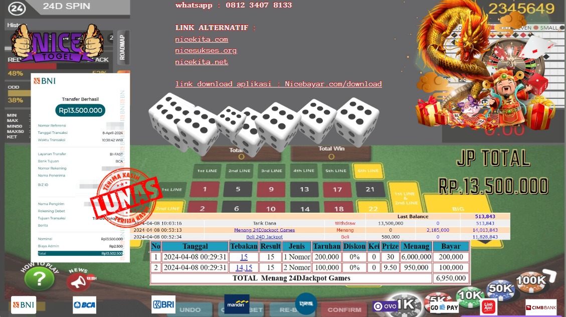 Selamat kepada User id : Hik** Telah berhasil mendapatkan kemenangan besar pada permainan LIVEGAMES 24DSPIN Dengan kemenangan Sebesar Rp.13.500.000,- Setelah mengisi formulir withdraw dengan kurung waktu hanya 5 – 10 menit pihak NICETOGEL sudah melakukan transfer kepada pemilik Userid dan dana sudah dapat di cairkan oleh pemenang. Bukti pembayaran yang kami berikan merupakan bukti pembayaran yang SAH / VALID yang langung di dapatkan melaui tanda transfer transaksi dari Bank yang di tuju.