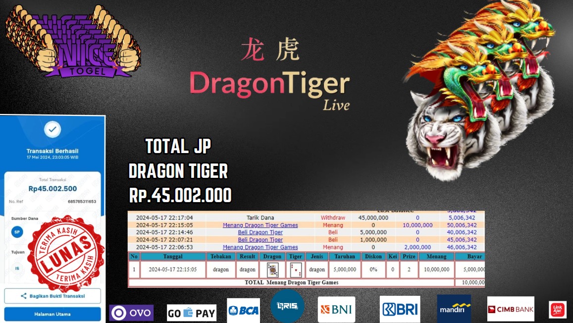 Selamat kepada User id : mus**** Telah berhasil mendapatkan kemenangan besar pada permainan DRAGON TIGER Dengan kemenangan Sebesar Rp.45.002.000,- Setelah mengisi formulir withdraw dengan kurung waktu hanya 5 – 10 menit pihak NICETOGEL sudah melakukan transfer kepada pemilik Userid dan dana sudah dapat di cairkan oleh pemenang. Bukti pembayaran yang kami berikan merupakan bukti pembayaran yang SAH / VALID yang langung di dapatkan melaui tanda transfer transaksi dari Bank yang di tuju.