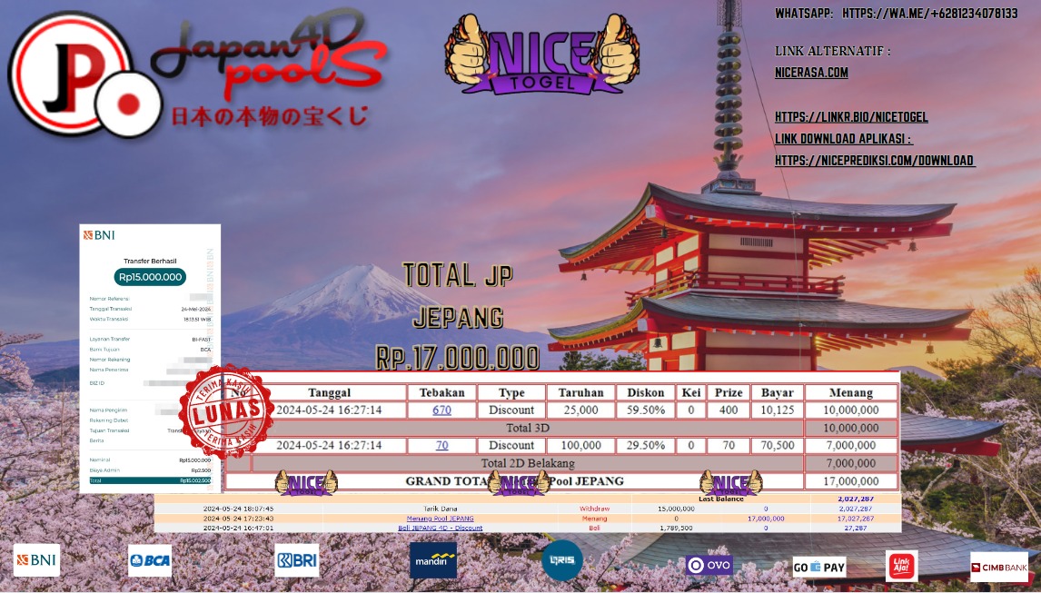 Selamat kepada User id : Juc** Telah berhasil mendapatkan kemenangan besar pada permainan TOGEL JEPANG Dengan kemenangan Sebesar Rp.17.000.000,- Setelah mengisi formulir withdraw dengan kurung waktu hanya 5 – 10 menit pihak NICETOGEL sudah melakukan transfer kepada pemilik Userid dan dana sudah dapat di cairkan oleh pemenang. Bukti pembayaran yang kami berikan merupakan bukti pembayaran yang SAH / VALID yang langung di dapatkan melaui tanda transfer transaksi dari Bank yang di tuju.