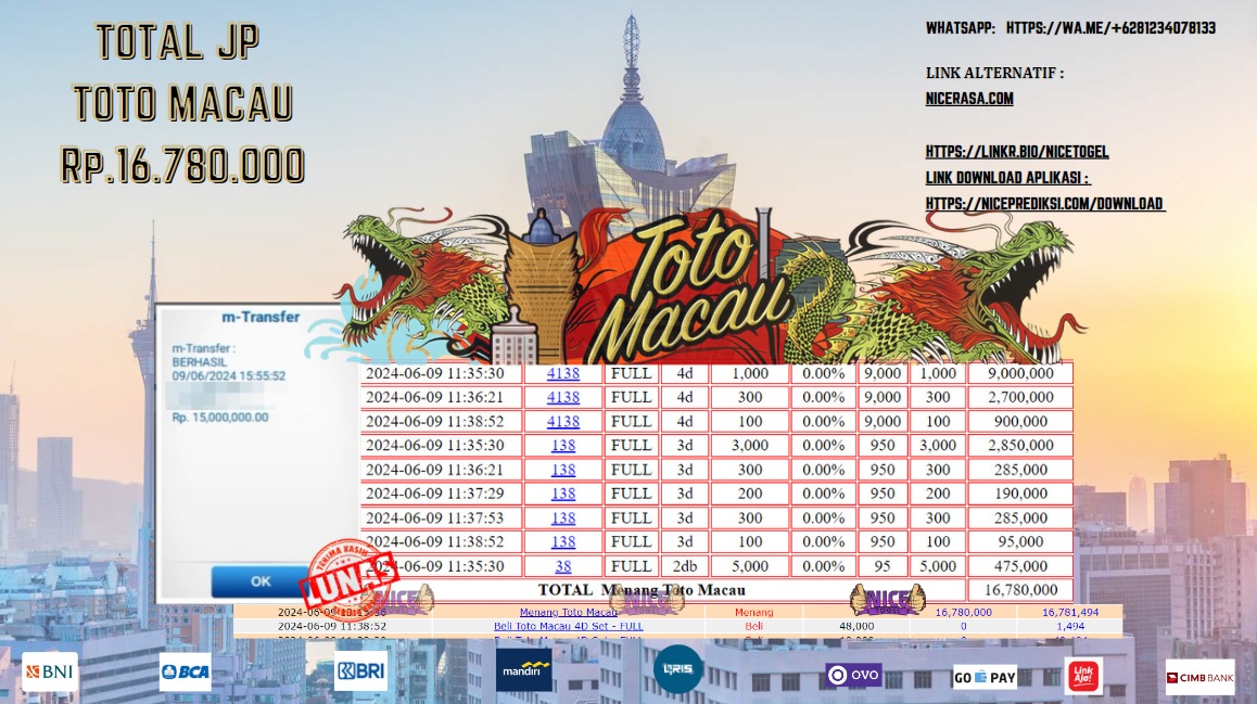 Selamat kepada User id : Eur** Telah berhasil mendapatkan kemenangan besar pada permainan TOGEL TOTO MACAU Dengan kemenangan Sebesar Rp.16.780.000,- Setelah mengisi formulir withdraw dengan kurung waktu hanya 5 – 10 menit pihak NICETOGEL sudah melakukan transfer kepada pemilik Userid dan dana sudah dapat di cairkan oleh pemenang. Bukti pembayaran yang kami berikan merupakan bukti pembayaran yang SAH / VALID yang langung di dapatkan melaui tanda transfer transaksi dari Bank yang di tuju.