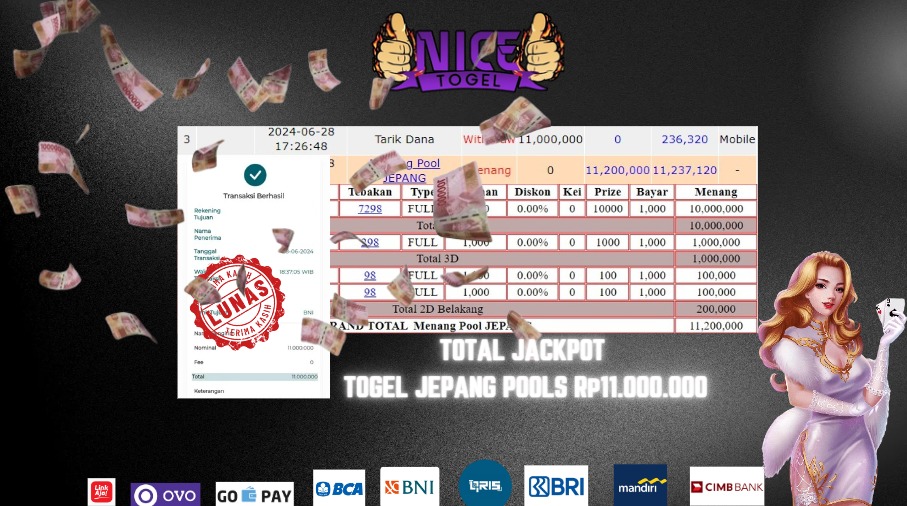 Selamat kepada User id : Pa*** Telah berhasil mendapatkan kemenangan besar pada permainan TOGEL JEPANG POOLS Dengan kemenangan Sebesar Rp. 11.000.000,- Setelah mengisi formulir withdraw dengan kurung waktu hanya 5 – 10 menit pihak NICETOGEL sudah melakukan transfer kepada pemilik Userid dan dana sudah dapat di cairkan oleh pemenang. Bukti pembayaran yang kami berikan merupakan bukti pembayaran yang SAH / VALID yang langung di dapatkan melaui tanda transfer transaksi dari Bank yang di tuju.