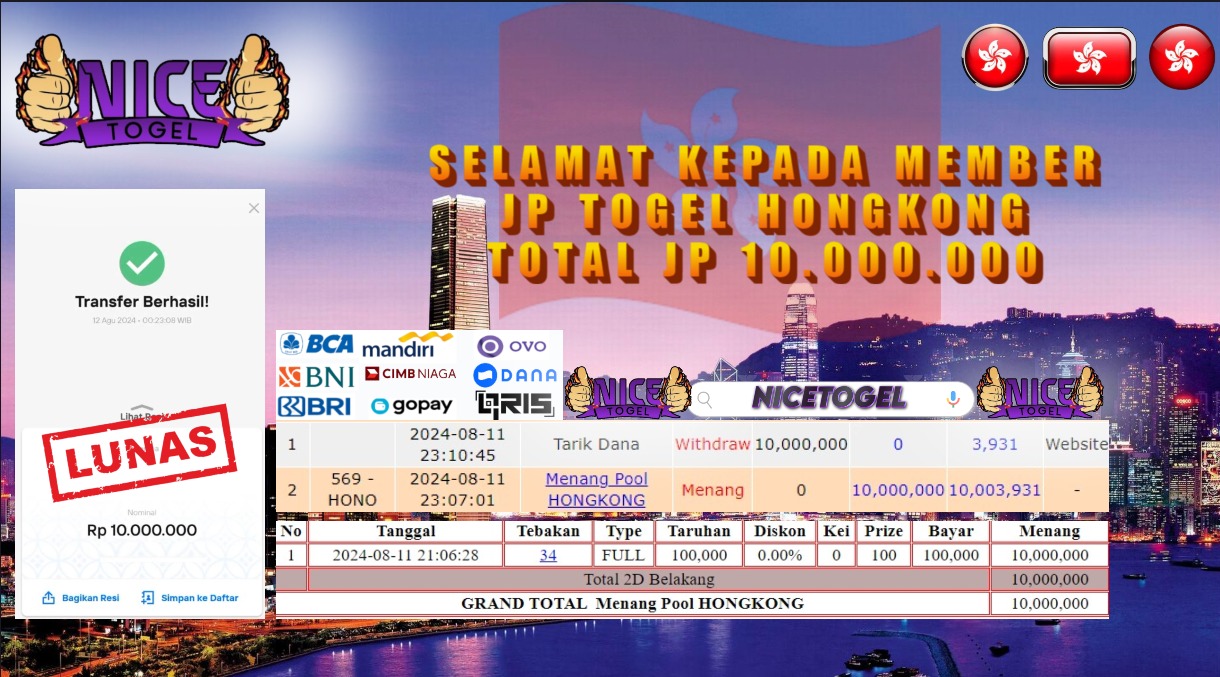 Selamat kepada User id : gus** Telah berhasil mendapatkan kemenangan besar pada permainan TOGEL HONGKONG POOLS Dengan kemenangan Sebesar Rp.10.000.000,- Setelah mengisi formulir withdraw dengan kurung waktu hanya 5 – 10 menit pihak NICETOGEL sudah melakukan transfer kepada pemilik Userid dan dana sudah dapat di cairkan oleh pemenang. Bukti pembayaran yang kami berikan merupakan bukti pembayaran yang SAH / VALID yang langung di dapatkan melaui tanda transfer transaksi dari Bank yang di tuju.