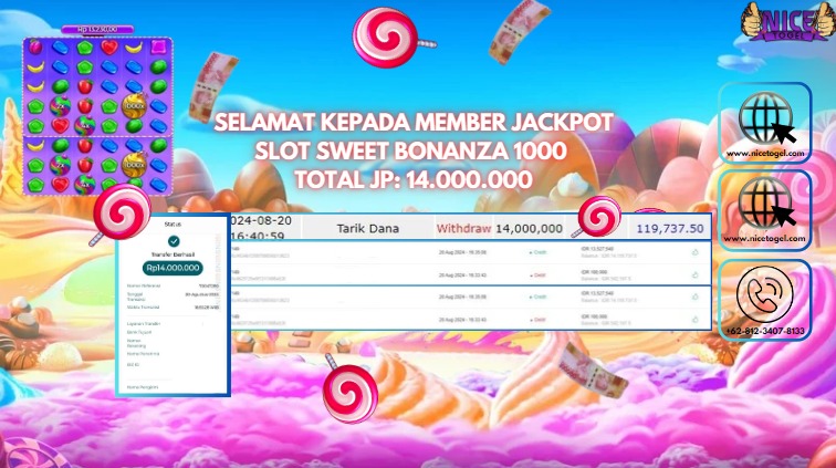 Selamat kepada User id : hok**** Telah berhasil mendapatkan kemenangan besar pada permainan SLOT SWEET BONANZA 1000  Dengan kemenangan Sebesar Rp.14.000.000,- Setelah mengisi formulir withdraw dengan kurung waktu hanya 5 – 10 menit pihak NICETOGEL sudah melakukan transfer kepada pemilik Userid dan dana sudah dapat di cairkan oleh pemenang. Bukti pembayaran yang kami berikan merupakan bukti pembayaran yang SAH / VALID yang langung di dapatkan melaui tanda transfer transaksi dari Bank yang di tuju.