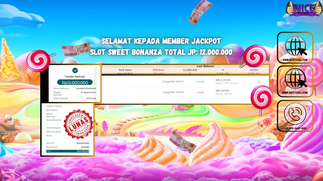 Selamat kepada User id : des**** Telah berhasil mendapatkan kemenangan besar pada permainan SLOT SWEET BONANZA Dengan kemenangan Sebesar Rp.12.000.000,- Setelah mengisi formulir withdraw dengan kurung waktu hanya 5 – 10 menit pihak NICETOGEL sudah melakukan transfer kepada pemilik Userid dan dana sudah dapat di cairkan oleh pemenang. Bukti pembayaran yang kami berikan merupakan bukti pembayaran yang SAH / VALID yang langung di dapatkan melaui tanda transfer transaksi dari Bank yang di tuju.