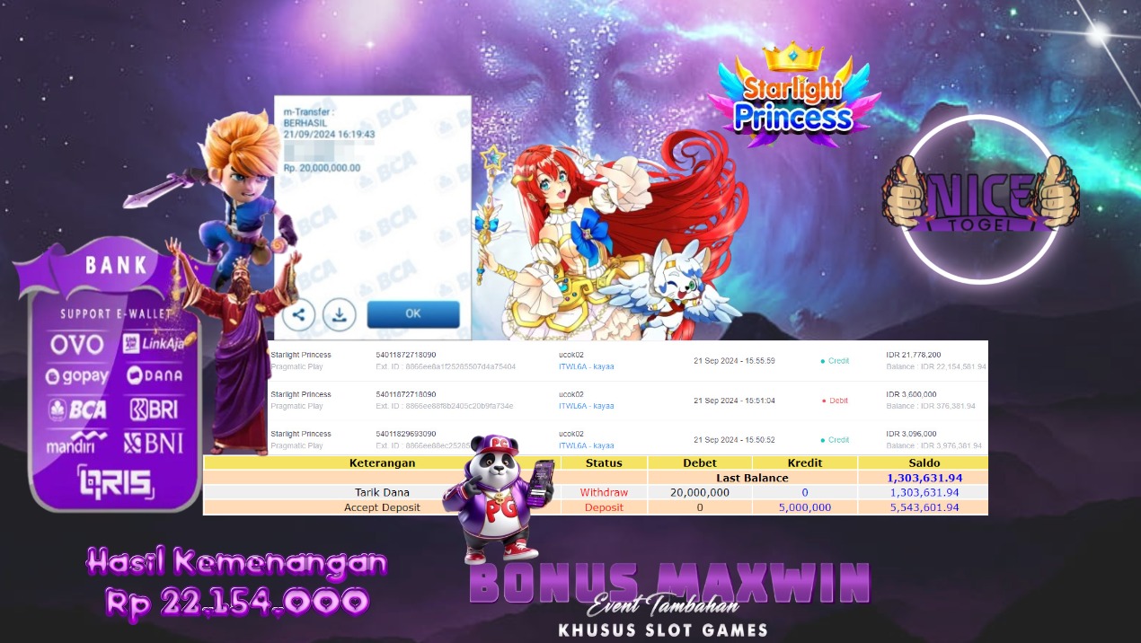 Selamat kepada User id : Carsd75** Telah berhasil mendapatkan kemenangan besar pada permainan SLOT STARLIGHT PRINCESS Dengan kemenangan Sebesar Rp.22.154.000,- Setelah mengisi formulir withdraw dengan kurung waktu hanya 5 – 10 menit pihak NICETOGEL sudah melakukan transfer kepada pemilik Userid dan dana sudah dapat di cairkan oleh pemenang. Bukti pembayaran yang kami berikan merupakan bukti pembayaran yang SAH / VALID yang langung di dapatkan melaui tanda transfer transaksi dari Bank yang di tuju.