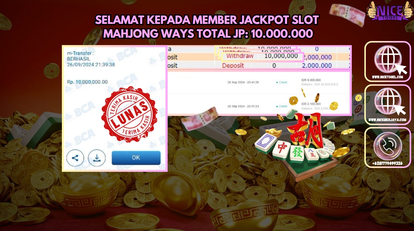 Selamat kepada User id : ril*** Telah berhasil mendapatkan kemenangan besar pada permainan SLOT MAHYONG WAYS Dengan kemenangan Sebesar Rp.10.000.000,- Setelah mengisi formulir withdraw dengan kurung waktu hanya 5 – 10 menit pihak NICETOGEL sudah melakukan transfer kepada pemilik Userid dan dana sudah dapat di cairkan oleh pemenang. Bukti pembayaran yang kami berikan merupakan bukti pembayaran yang SAH / VALID yang langung di dapatkan melaui tanda transfer transaksi dari Bank yang di tuju.