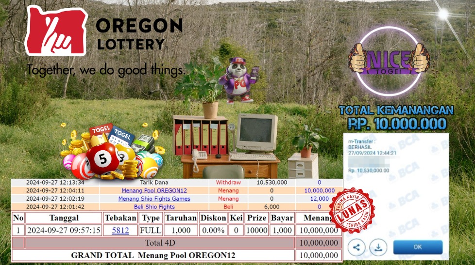 Selamat kepada User id : Bon56s** Telah berhasil mendapatkan kemenangan besar pada permainan TOGEL OREGON12 Dengan kemenangan Sebesar Rp.10.000.000,- Setelah mengisi formulir withdraw dengan kurung waktu hanya 5 – 10 menit pihak NICETOGEL sudah melakukan transfer kepada pemilik Userid dan dana sudah dapat di cairkan oleh pemenang. Bukti pembayaran yang kami berikan merupakan bukti pembayaran yang SAH / VALID yang langung di dapatkan melaui tanda transfer transaksi dari Bank yang di tuju.