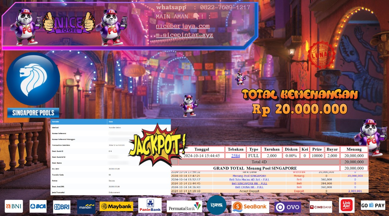 Selamat kepada User id : TAN*** Telah berhasil mendapatkan kemenangan besar pada permainan TOGEL SINGAPORE POOLS Dengan kemenangan Sebesar Rp.20.000.000,- Setelah mengisi formulir withdraw dengan kurung waktu hanya 5 – 10 menit pihak NICETOGEL sudah melakukan transfer kepada pemilik Userid dan dana sudah dapat di cairkan oleh pemenang. Bukti pembayaran yang kami berikan merupakan bukti pembayaran yang SAH / VALID yang langung di dapatkan melaui tanda transfer transaksi dari Bank yang di tuju.