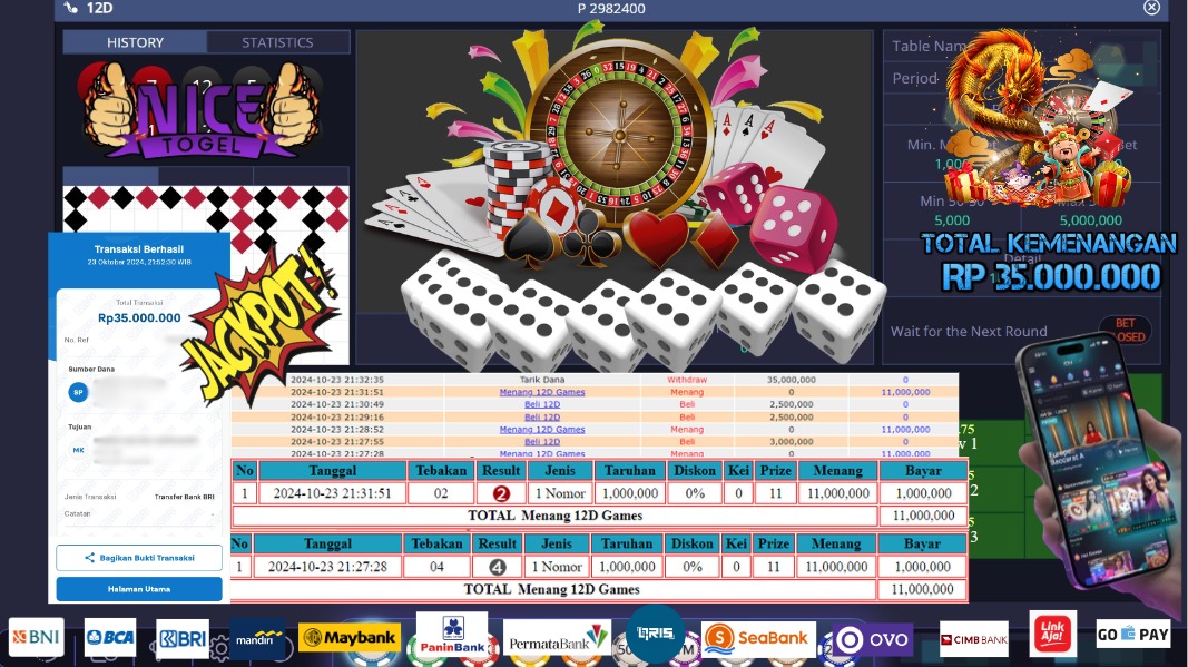 Selamat kepada User id : Leo87*** Telah berhasil mendapatkan kemenangan besar pada permainan LIVE GAMES 12D Dengan kemenangan Sebesar Rp.35.000.000,- Setelah mengisi formulir withdraw dengan kurung waktu hanya 5 – 10 menit pihak NICETOGEL sudah melakukan transfer kepada pemilik Userid dan dana sudah dapat di cairkan oleh pemenang. Bukti pembayaran yang kami berikan merupakan bukti pembayaran yang SAH / VALID yang langung di dapatkan melaui tanda transfer transaksi dari Bank yang di tuju.