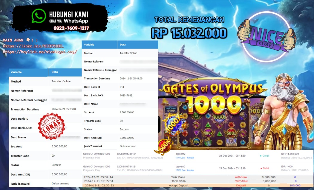 Selamat kepada User id : BGJOEM2*** Telah berhasil mendapatkan kemenangan besar pada permainan SLOT GATES OF OLYMPUS 1000 Dengan kemenangan Sebesar Rp.15.032.000,- Setelah mengisi formulir withdraw dengan kurung waktu hanya 5 – 10 menit pihak NICETOGEL sudah melakukan transfer kepada pemilik Userid dan dana sudah dapat di cairkan oleh pemenang. Bukti pembayaran yang kami berikan merupakan bukti pembayaran yang SAH / VALID yang langung di dapatkan melaui tanda transfer transaksi dari Bank yang di tuju.