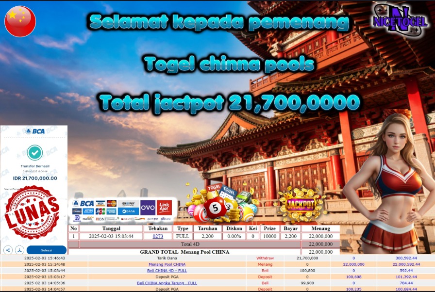 Selamat kepada User id : JEMSW** Telah berhasil mendapatkan kemenangan besar pada permainan TOGEL CHINA POOLS Dengan kemenangan Sebesar Rp.21.700.000,- Setelah mengisi formulir withdraw dengan kurung waktu hanya 5 – 10 menit pihak NICETOGEL sudah melakukan transfer kepada pemilik Userid dan dana sudah dapat di cairkan oleh pemenang. Bukti pembayaran yang kami berikan merupakan bukti pembayaran yang SAH / VALID yang langung di dapatkan melaui tanda transfer transaksi dari Bank yang di tuju.