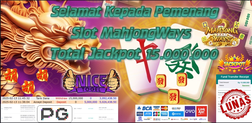 Selamat kepada member NICETOGEL User id : Wera** Telah berhasil mendapatkan kemenangan besar pada permainan SLOT MAHJONG WAYS Dengan kemenangan Sebesar Rp.10.000.000,- Setelah mengisi formulir withdraw dengan kurung waktu hanya 5 – 10 menit pihak NICETOGEL sudah melakukan transfer kepada pemilik Userid dan dana sudah dapat di cairkan oleh pemenang. Bukti pembayaran yang kami berikan merupakan bukti pembayaran yang SAH / VALID yang langung di dapatkan melaui tanda transfer transaksi dari Bank yang di tuju.