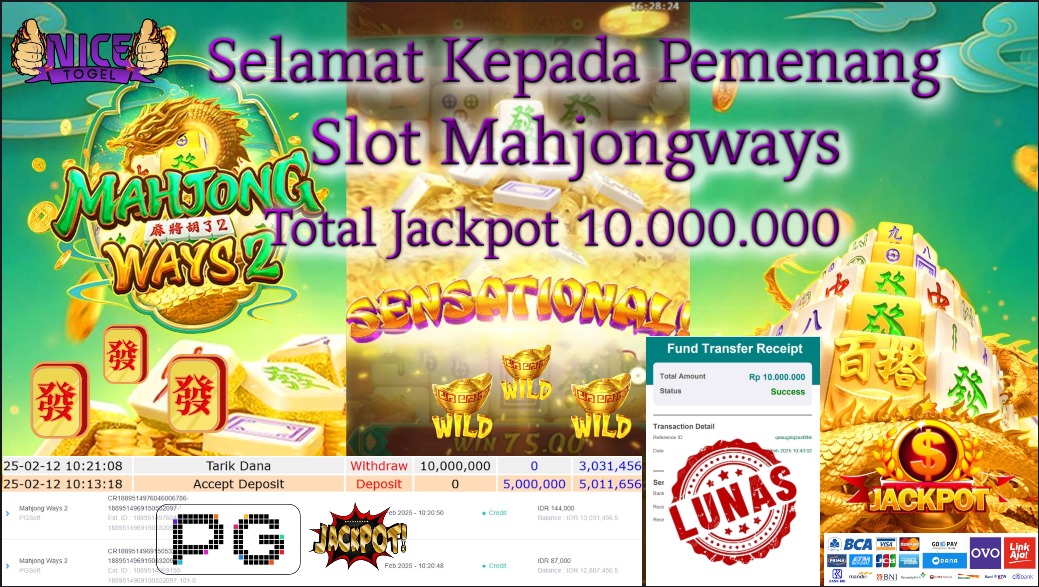 Selamat kepada member NICETOGEL User id : Reoa** Telah berhasil mendapatkan kemenangan besar pada permainan SLOT MAHJONG WAYS Dengan kemenangan Sebesar Rp.10.000.000,- Setelah mengisi formulir withdraw dengan kurung waktu hanya 5 – 10 menit pihak NICETOGEL sudah melakukan transfer kepada pemilik Userid dan dana sudah dapat di cairkan oleh pemenang. Bukti pembayaran yang kami berikan merupakan bukti pembayaran yang SAH / VALID yang langung di dapatkan melaui tanda transfer transaksi dari Bank yang di tuju.
