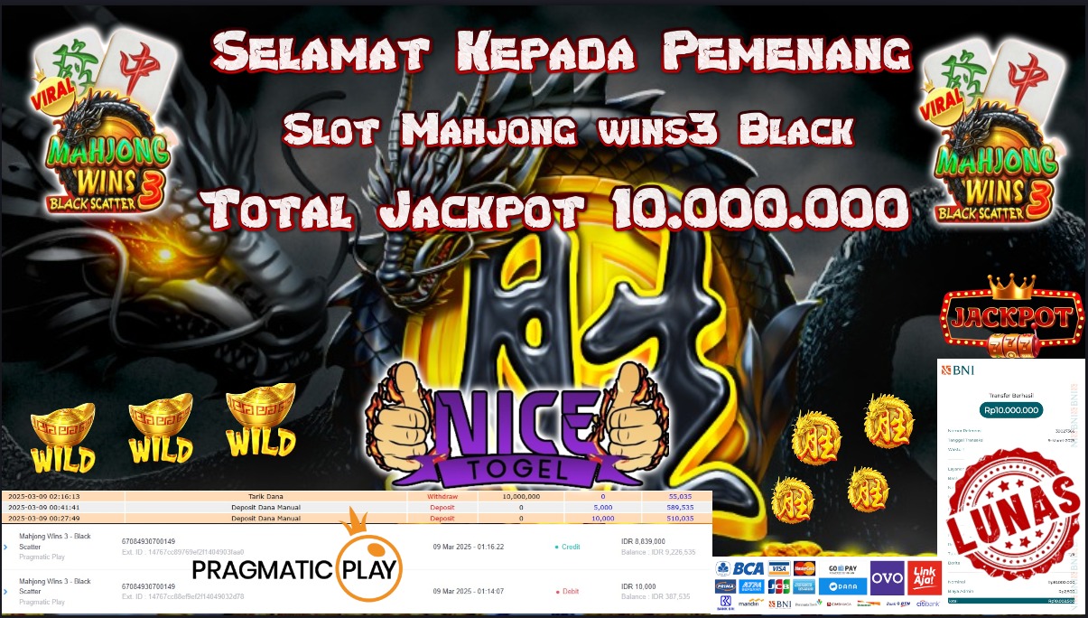 Selamat kepada member NICETOGEL User id : YOSA** Telah berhasil mendapatkan kemenangan besar pada permainan SLOT MAHJONG WINS 3 BLACK Dengan kemenangan Sebesar Rp.10.000.000,- Setelah mengisi formulir withdraw dengan kurung waktu hanya 5 – 10 menit pihak NICETOGEL sudah melakukan transfer kepada pemilik Userid dan dana sudah dapat di cairkan oleh pemenang. Bukti pembayaran yang kami berikan merupakan bukti pembayaran yang SAH / VALID yang langung di dapatkan melaui tanda transfer transaksi dari Bank yang di tuju.
