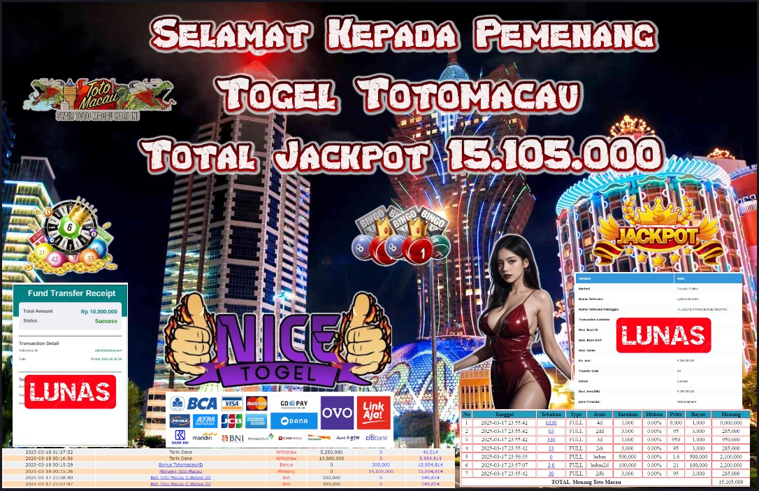 Selamat kepada member NICETOGEL User id : lop** Telah berhasil mendapatkan kemenangan besar pada permainan TOGEL TOTO MACAU POOLS Dengan kemenangan Sebesar Rp.15.105.000,- Setelah mengisi formulir withdraw dengan kurung waktu hanya 5 – 10 menit pihak NICETOGEL sudah melakukan transfer kepada pemilik Userid dan dana sudah dapat di cairkan oleh pemenang. Bukti pembayaran yang kami berikan merupakan bukti pembayaran yang SAH / VALID yang langung di dapatkan melaui tanda transfer transaksi dari Bank yang di tuju.
