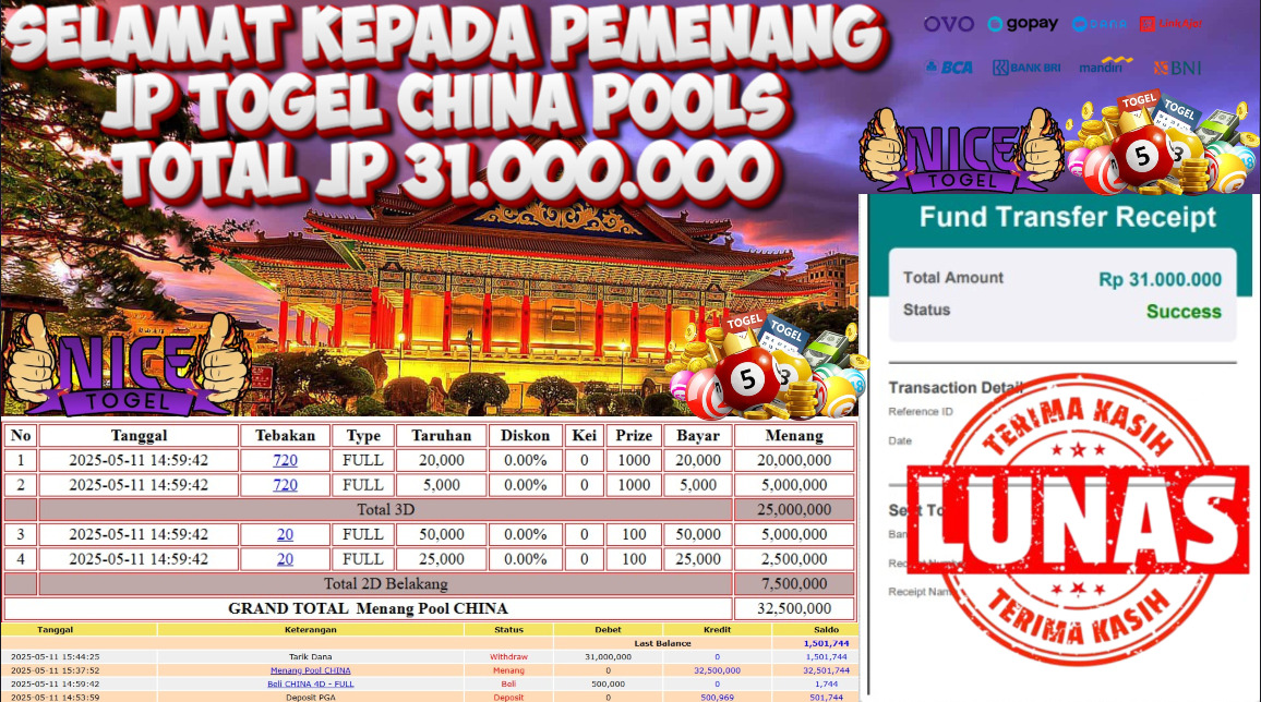 Selamat kepada member NICETOGEL User id : JOBD** Telah berhasil mendapatkan kemenangan besar pada permainan TOGEL CHINA POOLS Dengan kemenangan Sebesar Rp.31.000.000,- Setelah mengisi formulir withdraw dengan kurung waktu hanya 5 – 10 menit pihak NICETOGEL sudah melakukan transfer kepada pemilik Userid dan dana sudah dapat di cairkan oleh pemenang. Bukti pembayaran yang kami berikan merupakan bukti pembayaran yang SAH / VALID yang langung di dapatkan melaui tanda transfer transaksi dari Bank yang di tuju.