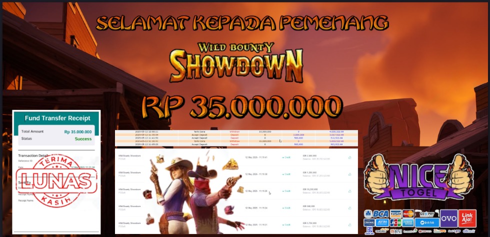 Selamat kepada member NICETOGEL User id :GRO** Telah berhasil mendapatkan kemenangan besar pada permainan SLOT WILD BOUNTY SHOWDOWN Dengan kemenangan Sebesar Rp 40.000.000,- Setelah mengisi formulir withdraw dengan kurung waktu hanya 5 – 10 menit pihak NICETOGEL sudah melakukan transfer kepada pemilik Userid dan dana sudah dapat di cairkan oleh pemenang. Bukti pembayaran yang kami berikan merupakan bukti pembayaran yang SAH / VALID yang langung di dapatkan melaui tanda transfer transaksi dari Bank yang di tuju.