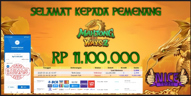 Selamat kepada User id : KIM** Telah berhasil mendapatkan kemenangan besar pada permainan SLOT MAHYONG WAYS 2 Dengan kemenangan Sebesar Rp.11.100.000,- Setelah mengisi formulir withdraw dengan kurung waktu hanya 5 – 10 menit pihak NICETOGEL sudah melakukan transfer kepada pemilik Userid dan dana sudah dapat di cairkan oleh pemenang. Bukti pembayaran yang kami berikan merupakan bukti pembayaran yang SAH / VALID yang langung di dapatkan melaui tanda transfer transaksi dari Bank yang di tuju.