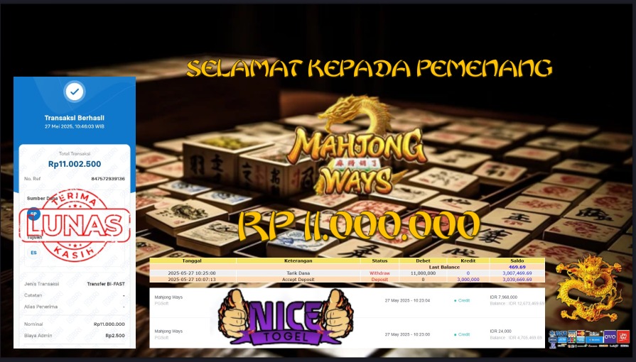 Selamat kepada member NICETOGEL User id : LOK** Telah berhasil mendapatkan kemenangan besar pada permainan SLOT MAHYONG WAYS Dengan kemenangan Sebesar Rp.11.000.000,- Setelah mengisi formulir withdraw dengan kurung waktu hanya 5 – 10 menit pihak NICETOGEL sudah melakukan transfer kepada pemilik Userid dan dana sudah dapat di cairkan oleh pemenang. Bukti pembayaran yang kami berikan merupakan bukti pembayaran yang SAH / VALID yang langung di dapatkan melaui tanda transfer transaksi dari Bank yang di tuju.