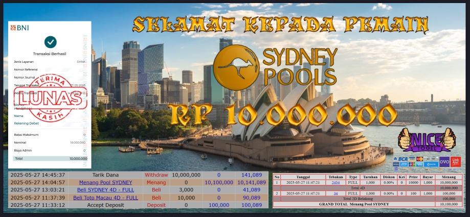 Selamat kepada User id : KISS** Telah berhasil mendapatkan kemenangan besar pada permainan TOGEL SYDNEY LOTTO Dengan kemenangan Sebesar Rp.10.000.000,- Setelah mengisi formulir withdraw dengan kurung waktu hanya 5 – 10 menit pihak NICETOGEL sudah melakukan transfer kepada pemilik Userid dan dana sudah dapat di cairkan oleh pemenang. Bukti pembayaran yang kami berikan merupakan bukti pembayaran yang SAH / VALID yang langung di dapatkan melaui tanda transfer transaksi dari Bank yang di tuju.