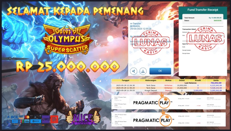 Selamat kepada member NICETOGEL User id LIC** Telah berhasil mendapatkan kemenangan besar pada permainan SLOT GATES OF OLYMPUS SUPER SCATTER Dengan kemenangan Sebesar Rp 25.000.000,- Setelah mengisi formulir withdraw dengan kurung waktu hanya 5 – 10 menit pihak NICETOGEL sudah melakukan transfer kepada pemilik Userid dan dana sudah dapat di cairkan oleh pemenang. Bukti pembayaran yang kami berikan merupakan bukti pembayaran yang SAH / VALID yang langung di dapatkan melaui tanda transfer transaksi dari Bank yang di tuju.