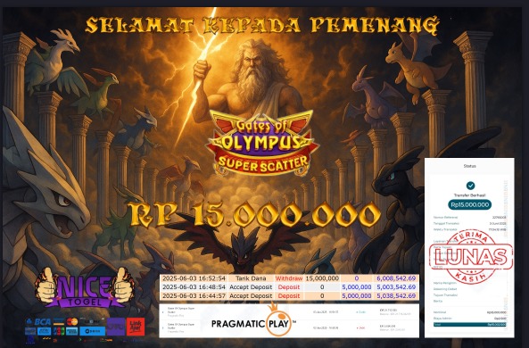 Selamat kepada member NICETOGEL User id : CRT** Telah berhasil mendapatkan kemenangan besar pada permainan SLOT GATES OF OLYMPUS SUPER SCATTER Dengan kemenangan Sebesar Rp.15.000.000,- Setelah mengisi formulir withdraw dengan kurung waktu hanya 5 – 10 menit pihak NICETOGEL sudah melakukan transfer kepada pemilik Userid dan dana sudah dapat di cairkan oleh pemenang. Bukti pembayaran yang kami berikan merupakan bukti pembayaran yang SAH / VALID yang langung di dapatkan melaui tanda transfer transaksi dari Bank yang di tuju.