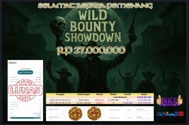 Selamat kepada User id : NBS*** Telah berhasil mendapatkan kemenangan besar pada permainan JACKPOT SLOT WILD BOUNTY SHOWDOWN Dengan kemenangan Sebesar Rp.27.000.000,- Setelah mengisi formulir withdraw dengan kurung waktu hanya 5 – 10 menit pihak NICETOGEL sudah melakukan transfer kepada pemilik Userid dan dana sudah dapat di cairkan oleh pemenang. Bukti pembayaran yang kami berikan merupakan bukti pembayaran yang SAH / VALID yang langung di dapatkan melaui tanda transfer transaksi dari Bank yang di tuju.
