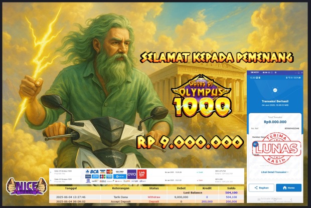 Selamat kepada User id : BNM*** Telah berhasil mendapatkan kemenangan besar pada permainan JACKPOT SLOT GATES OF OLYMPUS 1000 Dengan kemenangan Sebesar Rp.9.000.000,- Setelah mengisi formulir withdraw dengan kurung waktu hanya 5 – 10 menit pihak NICETOGEL sudah melakukan transfer kepada pemilik Userid dan dana sudah dapat di cairkan oleh pemenang. Bukti pembayaran yang kami berikan merupakan bukti pembayaran yang SAH / VALID yang langung di dapatkan melaui tanda transfer transaksi dari Bank yang di tuju.