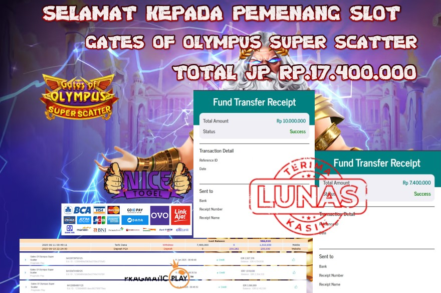 Selamat kepada member NICETOGEL User id :JIN7** Telah berhasil mendapatkan kemenangan besar pada permainan SLOT GATES OF OLYMPUS SUPER SCATTER Dengan kemenangan Sebesar Rp.17.400.000,- Setelah mengisi formulir withdraw dengan kurung waktu hanya 5 – 10 menit pihak NICETOGEL sudah melakukan transfer kepada pemilik Userid dan dana sudah dapat di cairkan oleh pemenang. Bukti pembayaran yang kami berikan merupakan bukti pembayaran yang SAH / VALID yang langung di dapatkan melaui tanda transfer transaksi dari Bank yang di tuju.