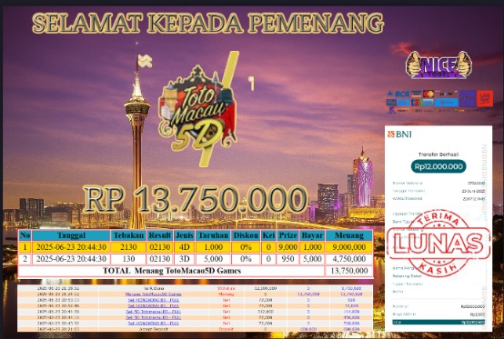 Selamat kepada User id : ZXX*** Telah berhasil mendapatkan kemenangan besar pada permainan JACKPOT TOGEL TOTO MACAU 5D Dengan kemenangan Sebesar Rp.13.750.000,- Setelah mengisi formulir withdraw dengan kurung waktu hanya 5 – 10 menit pihak NICETOGEL sudah melakukan transfer kepada pemilik Userid dan dana sudah dapat di cairkan oleh pemenang. Bukti pembayaran yang kami berikan merupakan bukti pembayaran yang SAH / VALID yang langung di dapatkan melaui tanda transfer transaksi dari Bank yang di tuju.