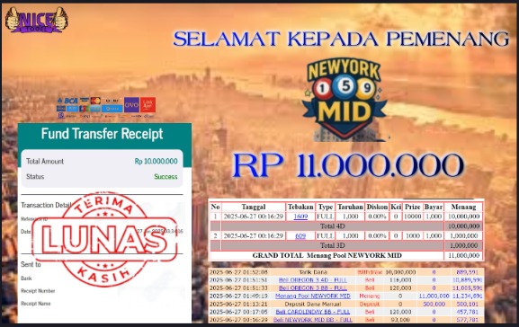Selamat kepada User id : DEW*** Telah berhasil mendapatkan kemenangan besar pada permainan JACKPOT TOGEL NEWYORK MID Dengan kemenangan Sebesar Rp.11.000.000,- Setelah mengisi formulir withdraw dengan kurung waktu hanya 5 – 10 menit pihak NICETOGEL sudah melakukan transfer kepada pemilik Userid dan dana sudah dapat di cairkan oleh pemenang. Bukti pembayaran yang kami berikan merupakan bukti pembayaran yang SAH / VALID yang langung di dapatkan melaui tanda transfer transaksi dari Bank yang di tuju.