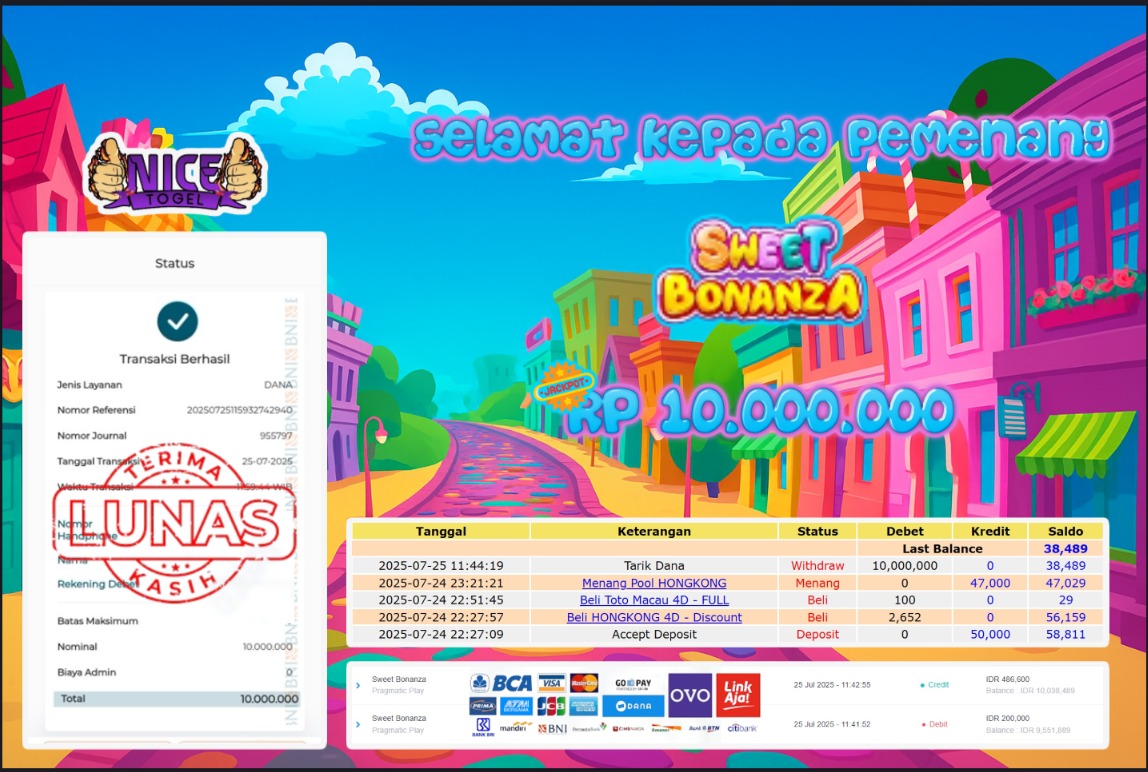Selamat kepada User id : AFIF** Telah berhasil mendapatkan kemenangan besar pada permainan JACKPOT SLOT SWEET BONANZA Dengan kemenangan Sebesar Rp.10.000.000,- Setelah mengisi formulir withdraw dengan kurung waktu hanya 5 – 10 menit pihak NICETOGEL sudah melakukan transfer kepada pemilik Userid dan dana sudah dapat di cairkan oleh pemenang. Bukti pembayaran yang kami berikan merupakan bukti pembayaran yang SAH / VALID yang langung di dapatkan melaui tanda transfer transaksi dari Bank yang di tuju.