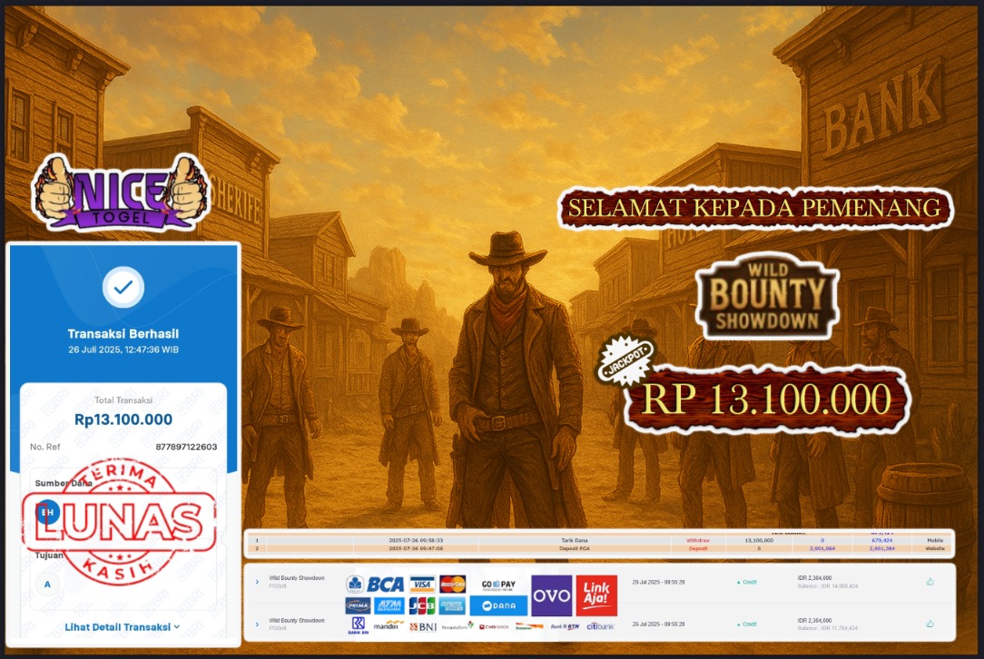 Selamat kepada User id : HYS3** Telah berhasil mendapatkan kemenangan besar pada permainan JACKPOT SLOT WILD BOUNTY SHOWDOWN Dengan kemenangan Sebesar Rp.13.100.000,- Setelah mengisi formulir withdraw dengan kurung waktu hanya 5 – 10 menit pihak NICETOGEL sudah melakukan transfer kepada pemilik Userid dan dana sudah dapat di cairkan oleh pemenang. Bukti pembayaran yang kami berikan merupakan bukti pembayaran yang SAH / VALID yang langung di dapatkan melaui tanda transfer transaksi dari Bank yang di tuju.