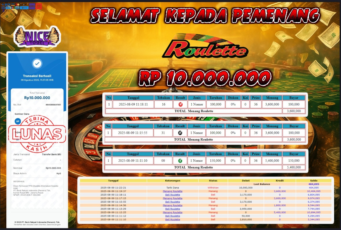 Selamat kepada User id : JOBS*** Telah berhasil mendapatkan kemenangan besar pada permainan JACKPOT ROULETTE Dengan kemenangan Sebesar Rp.10.000.000,- Setelah mengisi formulir withdraw dengan kurung waktu hanya 5 – 10 menit pihak NICETOGEL sudah melakukan transfer kepada pemilik Userid dan dana sudah dapat di cairkan oleh pemenang. Bukti pembayaran yang kami berikan merupakan bukti pembayaran yang SAH / VALID yang langung di dapatkan melaui tanda transfer transaksi dari Bank yang di tuju.