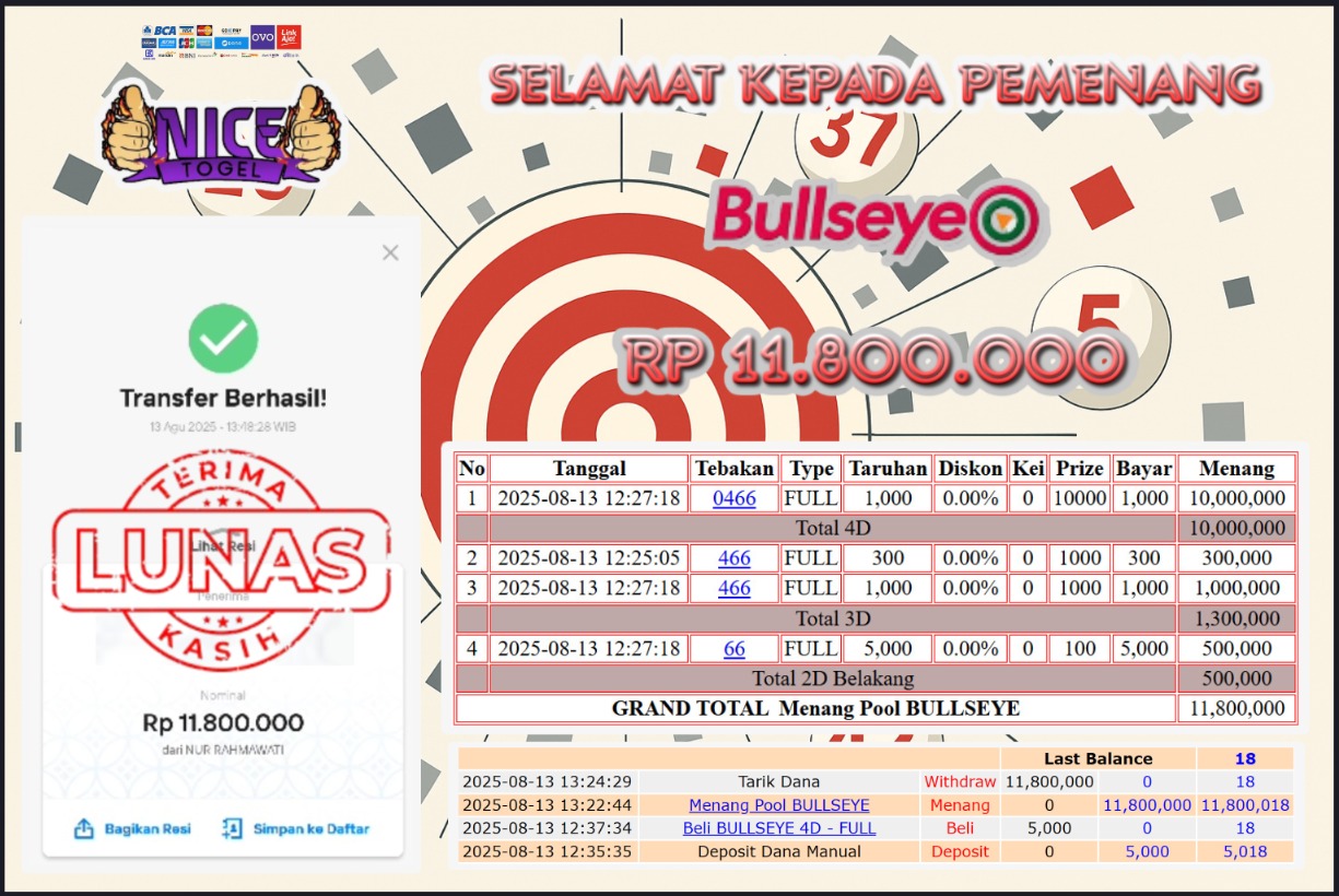 selamat kepada User id : BUD25* Telah berhasil mendapatkan kemenangan besar pada permainan TOGEL BULLSEYE Dengan kemenangan Sebesar Rp.11.800.000,- Setelah mengisi formulir withdraw dengan kurung waktu hanya 5 – 10 menit pihak NICETOGEL sudah melakukan transfer kepada pemilik Userid dan dana sudah dapat di cairkan oleh pemenang. Bukti pembayaran yang kami berikan merupakan bukti pembayaran yang SAH / VALID yang langung di dapatkan melaui tanda transfer transaksi dari Bank yang di tuju.