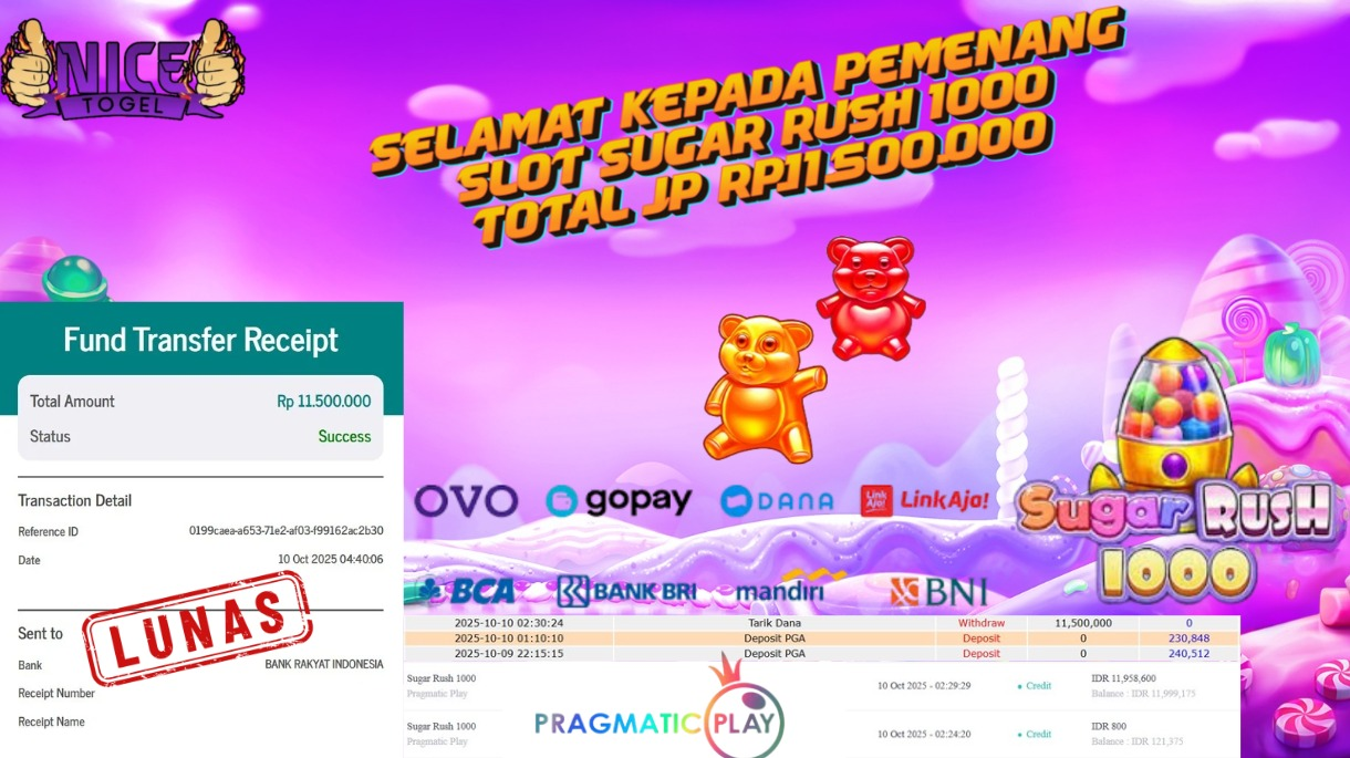 Selamat kepada User id : HAHA** Telah berhasil mendapatkan kemenangan besar pada permainan JACKPOT SLOT SUGAR RUSH 1000 Dengan kemenangan Sebesar Rp.,11.500.000 Setelah mengisi formulir withdraw dengan kurung waktu hanya 5 – 10 menit pihak NICETOGEL sudah melakukan transfer kepada pemilik Userid dan dana sudah dapat di cairkan oleh pemenang. Bukti pembayaran yang kami berikan merupakan bukti pembayaran yang SAH / VALID yang langung di dapatkan melaui tanda transfer transaksi dari Bank yang di tuju.