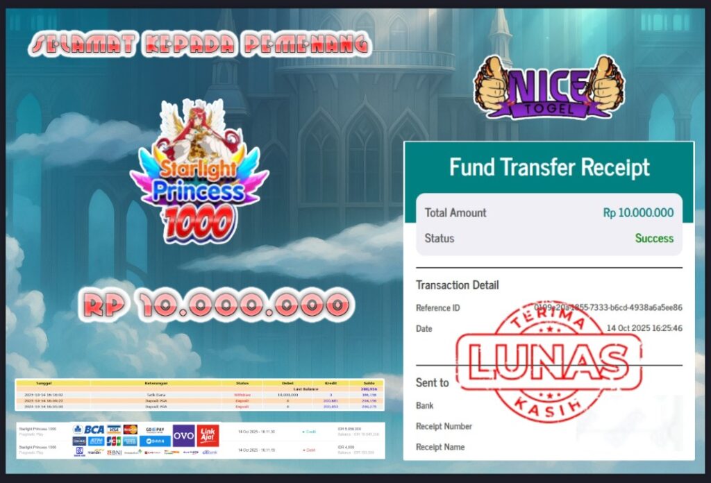 Selamat kepada User id : BINTA** Telah berhasil mendapatkan kemenangan besar pada permainan JACKPOT SLOT GATES OF OLYMPUS 1000 Dengan kemenangan Sebesar Rp.10.000.000,- Setelah mengisi formulir withdraw dengan kurung waktu hanya 5 – 10 menit pihak NICETOGEL sudah melakukan transfer kepada pemilik Userid dan dana sudah dapat di cairkan oleh pemenang. Bukti pembayaran yang kami berikan merupakan bukti pembayaran yang SAH / VALID yang langung di dapatkan melaui tanda transfer transaksi dari Bank yang di tuju.