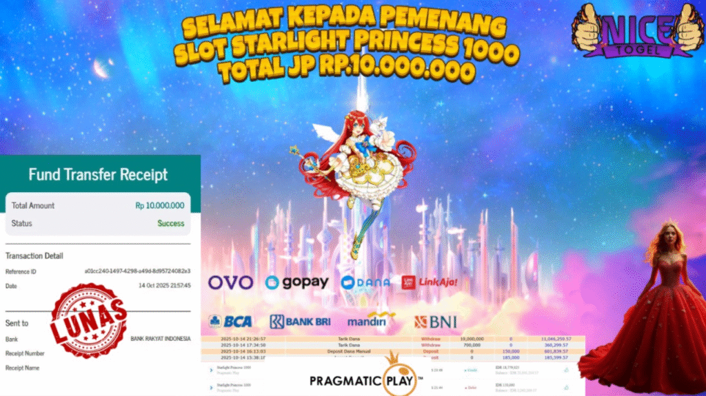 Selamat kepada User id : BINTA** Telah berhasil mendapatkan kemenangan besar pada permainan JACKPOT SLOT STARLIGHT PRINCESS 1000 Dengan kemenangan Sebesar Rp.10.000.000,- Setelah mengisi formulir withdraw dengan kurung waktu hanya 5 – 10 menit pihak NICETOGEL sudah melakukan transfer kepada pemilik Userid dan dana sudah dapat di cairkan oleh pemenang. Bukti pembayaran yang kami berikan merupakan bukti pembayaran yang SAH / VALID yang langung di dapatkan melaui tanda transfer transaksi dari Bank yang di tuju.