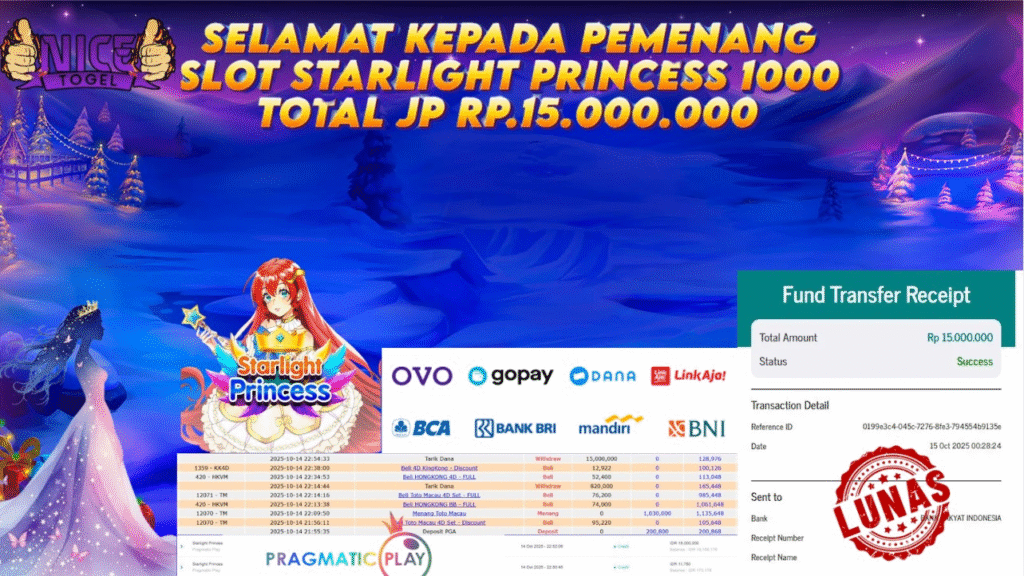 Selamat kepada User id : KIKI** Telah berhasil mendapatkan kemenangan besar pada permainan JACKPOT SLOT STARLIGHT PRINCESS 1000 Dengan kemenangan Sebesar Rp.15.000.000,- Setelah mengisi formulir withdraw dengan kurung waktu hanya 5 – 10 menit pihak NICETOGEL sudah melakukan transfer kepada pemilik Userid dan dana sudah dapat di cairkan oleh pemenang. Bukti pembayaran yang kami berikan merupakan bukti pembayaran yang SAH / VALID yang langung di dapatkan melaui tanda transfer transaksi dari Bank yang di tuju.