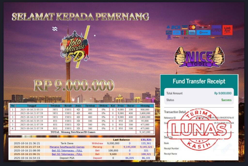 Selamat kepada User id : BLRK** Telah berhasil mendapatkan kemenangan besar pada permainan JACKPOT TOGEL TOTOMACAU 5D Dengan kemenangan Sebesar Rp.9.000.000,- Setelah mengisi formulir withdraw dengan kurung waktu hanya 5 – 10 menit pihak NICETOGEL sudah melakukan transfer kepada pemilik Userid dan dana sudah dapat di cairkan oleh pemenang. Bukti pembayaran yang kami berikan merupakan bukti pembayaran yang SAH / VALID yang langung di dapatkan melaui tanda transfer transaksi dari Bank yang di tuju.