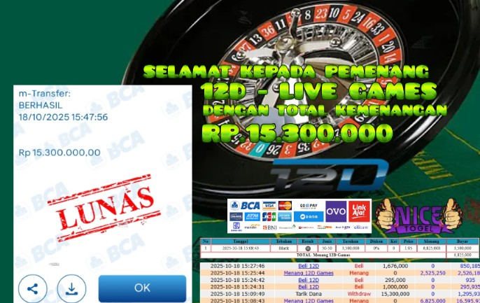 Selamat kepada User id : LING** Telah berhasil mendapatkan kemenangan besar pada permainan JACKPOT 12D – LIVE GAMES Dengan kemenangan Sebesar Rp.15.300.000,- Setelah mengisi formulir withdraw dengan kurung waktu hanya 5 – 10 menit pihak NICETOGEL sudah melakukan transfer kepada pemilik Userid dan dana sudah dapat di cairkan oleh pemenang. Bukti pembayaran yang kami berikan merupakan bukti pembayaran yang SAH / VALID yang langung di dapatkan melaui tanda transfer transaksi dari Bank yang di tuju.