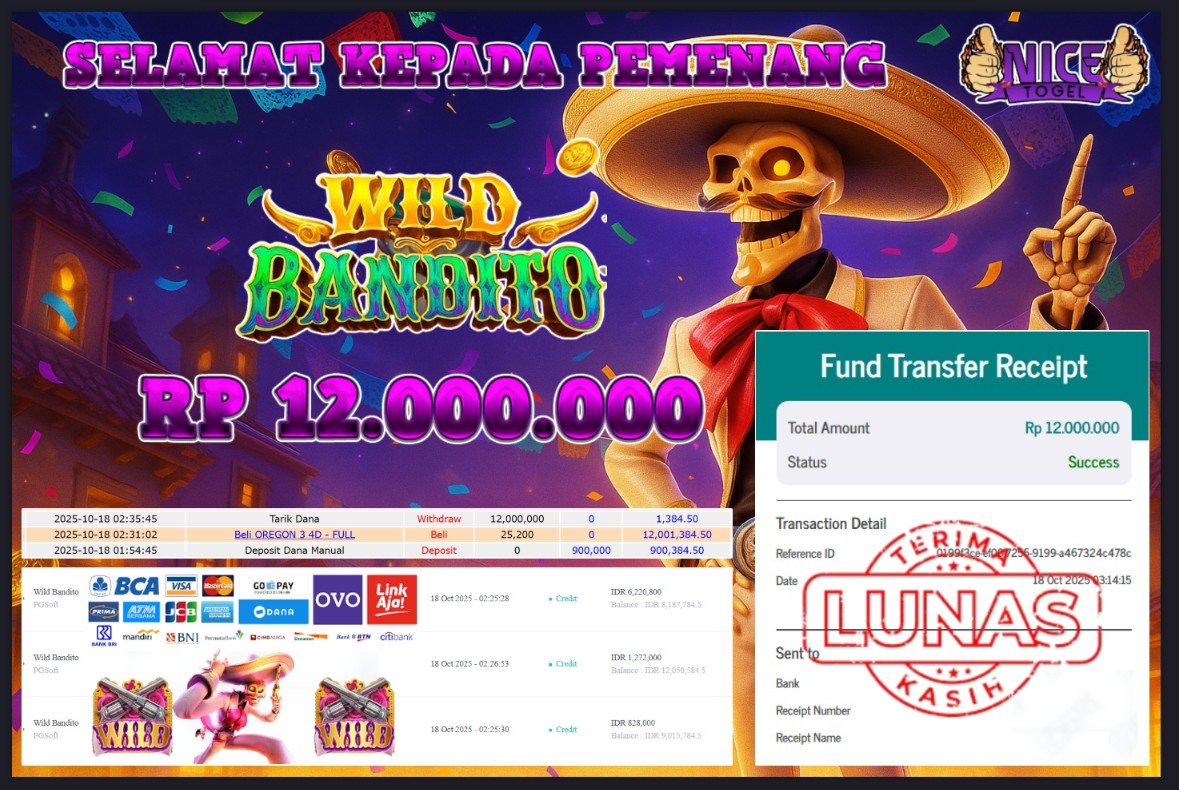 Selamat kepada User id : BUYTD** Telah berhasil mendapatkan kemenangan besar pada permainan JACKPOT SLOT WILD BANDITO Dengan kemenangan Sebesar Rp.12.000.000,- Setelah mengisi formulir withdraw dengan kurung waktu hanya 5 – 10 menit pihak NICETOGEL sudah melakukan transfer kepada pemilik Userid dan dana sudah dapat di cairkan oleh pemenang. Bukti pembayaran yang kami berikan merupakan bukti pembayaran yang SAH / VALID yang langung di dapatkan melaui tanda transfer transaksi dari Bank yang di tuju.