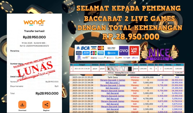 Selamat kepada User id : JUN3** Telah berhasil mendapatkan kemenangan besar pada permainan JACKPOT BACCARAT 2 LIVE GAMES Dengan kemenangan Sebesar Rp.28.950.000,- Setelah mengisi formulir withdraw dengan kurung waktu hanya 5 – 10 menit pihak NICETOGEL sudah melakukan transfer kepada pemilik Userid dan dana sudah dapat di cairkan oleh pemenang. Bukti pembayaran yang kami berikan merupakan bukti pembayaran yang SAH / VALID yang langung di dapatkan melaui tanda transfer transaksi dari Bank yang di tuju.