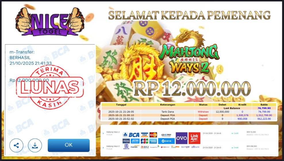 Selamat kepada User id : RON33** Telah berhasil mendapatkan kemenangan besar pada permainan JACKPOT SLOT MAHYONG WAYS 2 Dengan kemenangan Sebesar Rp.12.000.000,- Setelah mengisi formulir withdraw dengan kurung waktu hanya 5 – 10 menit pihak NICETOGEL sudah melakukan transfer kepada pemilik Userid dan dana sudah dapat di cairkan oleh pemenang. Bukti pembayaran yang kami berikan merupakan bukti pembayaran yang SAH / VALID yang langung di dapatkan melaui tanda transfer transaksi dari Bank yang di tuju.