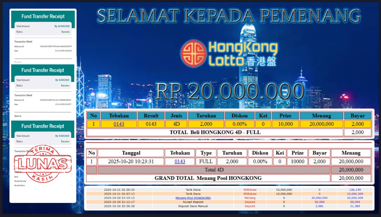 Selamat kepada User id : KANGT** Telah berhasil mendapatkan kemenangan besar pada permainan JACKPOT TOGEL HONGKONG LOTTO Dengan kemenangan Sebesar Rp.20.000.000,- Setelah mengisi formulir withdraw dengan kurung waktu hanya 5 – 10 menit pihak NICETOGEL sudah melakukan transfer kepada pemilik Userid dan dana sudah dapat di cairkan oleh pemenang. Bukti pembayaran yang kami berikan merupakan bukti pembayaran yang SAH / VALID yang langung di dapatkan melaui tanda transfer transaksi dari Bank yang di tuju.